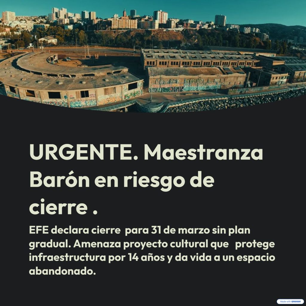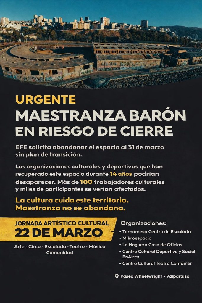 Tras catorce años de ocupación y gestión comunitaria en la Maestranza Barón , las organizaciones que dan vida al espacio — Tornamesa Centro de Escalada, Mikroespacio, La Hoguera Casa de Oficios, Centro Cultural Deportivo y Social EnAires y Teatro Container — manifestamos nuestra profunda preocupación frente a la reciente decisión de EFE de cesar actividades y clausurar el lugar el próximo 31 de marzo de 2026 .